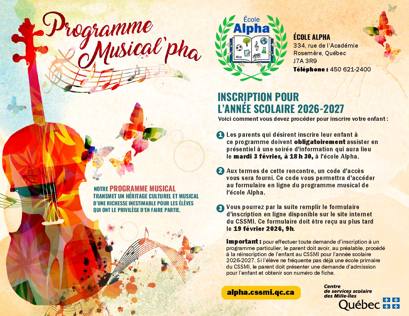 VOUS SOUHAITEZ INSCRIRE VOTRE ENFANT AU PROGRAMME MUSICAL DE NOTRE ÉCOLE POUR LA RENTRÉE SCOLAIRE 2026-2027 ? Voici comment vous devez procéder pour inscrire votre enfant : Il est obligatoire, pour tous les parents, d’assister à la rencontre obligatoire, en présentiel, qui explique le processus pour que votre enfant soit admis. La rencontre se tiendra le 3 février 2026 […]